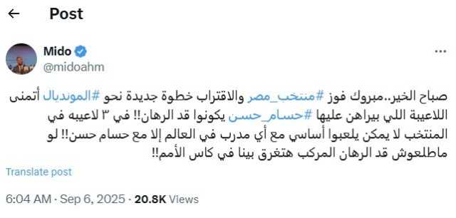 وكتب أحمد حسام ميدو عبر حسابه الرسمي على موقع التواصل الاجتماعي «إكس»:« صباح الخير.. مبروك فوز منتخب مصر والاقتراب خطوة جديدة نحو المونديال أتمنى اللاعيبة اللي بيراهن عليها حسام حسن يكونوا قد الرهان!!».