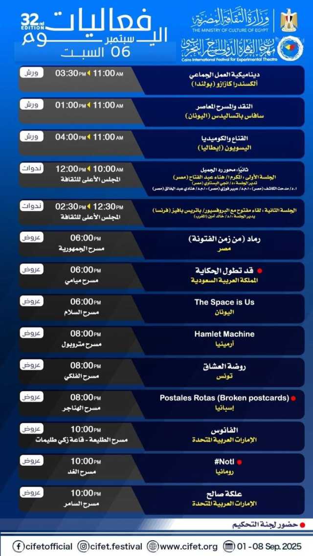 وتنطلق العروض المسرحية في السادسة مساءً بثلاثة عروض متزامنة: “رماد (من زمن الفتونة)” من مصر على مسرح الجمهورية، و”قد تطول الحكاية” من السعودية على مسرح ميامي، و”The Space is Us” من اليونان على مسرح السلام.