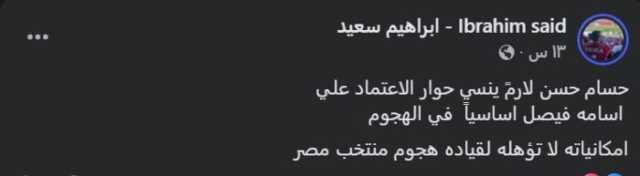 وكتب إبراهيم سعيد، عبر صفحته الرسمية على موقع التواصل الاجتماعي «فيسبوك»: «حسام حسن لازم ينسي حوار الاعتماد على أسامة فيصل أساسيًا في الهجوم، إمكانياته لا تؤهله لقيادة هجوم منتخب مصر».