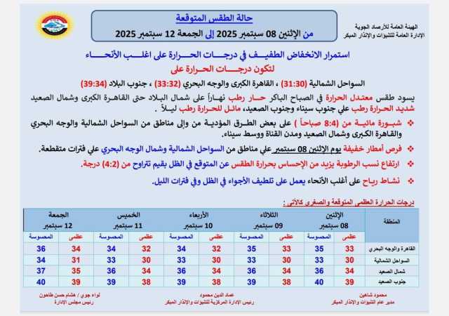 أعلنت هيئة الأرصاد الجوية عن حالة الطقس من اليوم الأثنين حتى الجمعة 12 سبتمبر ، ليشهد استمرار انخفاض طفيف في درجات الحرارة على أغلب الأنحاء لتكون درجات الحرارة على السواحل الشمالية 30إلى 31 درجة ، والقاهرة الكبري والوجه البحرى 32 إلى 33 و جنوب البلاد 34 إلى 39 درجة .