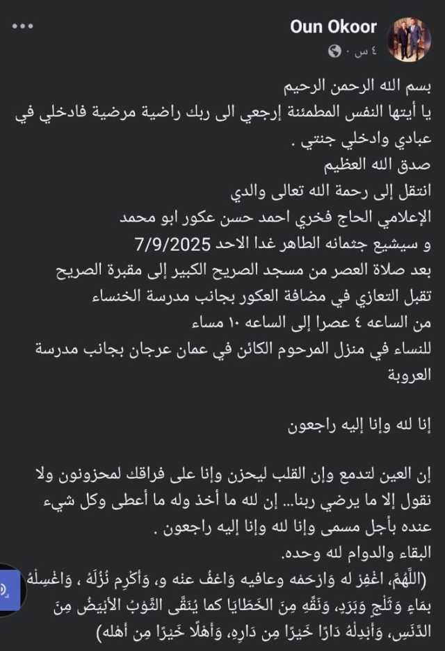واستكمل نجل الراحل فخري العكور حديثه قائلًا: “سيشيع جثمانه الطاهر اليوم الأحد 7/9/2025.. بعد صلاة العصر من مسجد الصريح الكبير إلى مقبرة الصريح .. تقبل التعازي في مضافة العكور بجانب مدرسة الخنساء من الساعة 4 عصرا إلى الساعة 10 مساء .. وللنساء في منزل المرحوم الكائن في عمان عرجان بجانب مدرسة العروبة .. إنا لله وإنا إليه راجعون”.