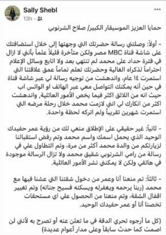 رسالة أرملة نجل صلاح الشرنوبي إلى حماهاوكتبت سالي، منشور عبر صفحتها على موقع «فيسبوك» قائلة فيه: «حمايا العزيز الموسيقار صلاح الشرنوبي.