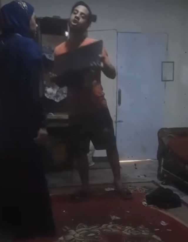 وظهر الشاب في مقطع الفيديو يتحدث بألفاظ خادشة ويقوم بالتعدي على والدته بالسب محاولا سرقة شاشة من المنزل وبيعها لشراء المواد المخدرة بها.