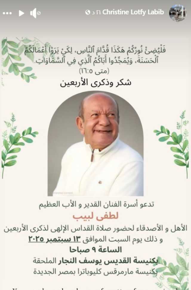 دعت أسرة الفنان القدير لطفي لبيب، الأهل والأصدقاء لحضور صلاة القداس الإلهى لذكرى الأربعين وذلك يوم السبت الموافق ۱۳ سبتمبر ۲۰۲٥ الساعة 9 صباحا، بكنيسة القديس يوسف النجار الملحقة، بكنيسة مارمرقس كليوباترا بمصر الجديدة.