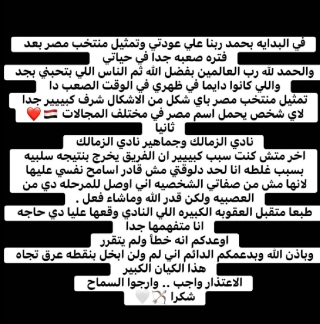 وأكمل: " طبعا متقبل العقوبه اللي النادي وقعها عليا دي حاجه انا متفهمها جدا، اوعدكم ان اللي فات خطأ ولم يتكرر، وبإذن الله وبدعمكم الدائم اني لم ولن ابخل بنقطه عرق تجاه هذا الكيان الكبير