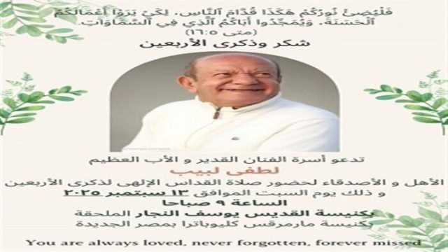 وكتبت كريستين نجلة الفنان لطفى لبيب، عبر حساباتها بمواقع التواصل الاجتماعي: «تدعو أسرة الفنان القدير والأب العظيم لطفى لبيب الأهل والأصدقاء لحضور صلاة القداس الإلهي لذكرى الأربعين، وذلك يوم السبت الموافق 13 سبتمبر 2025 الساعة 9 صباحا بكنيسة القديس يوسف النجار الملحقة بكنيسة مار مرقس كليوباترا بمصر الجديدة».