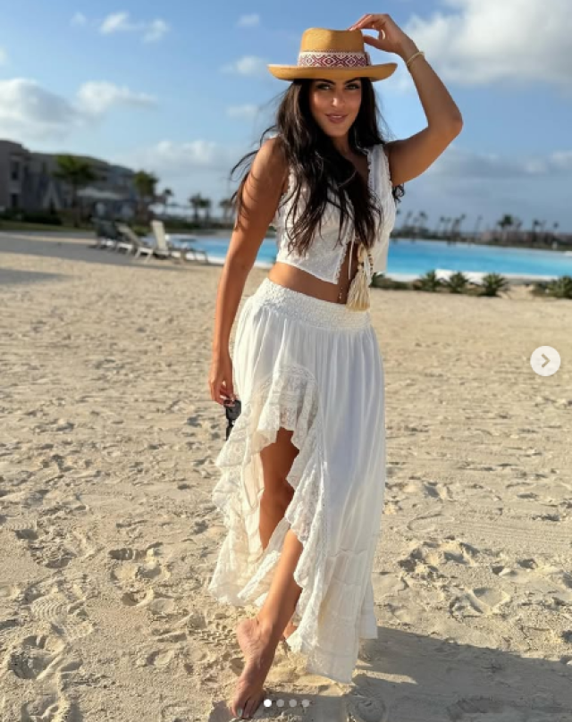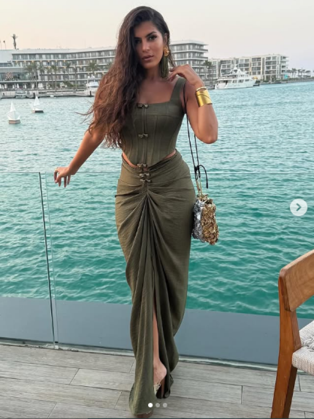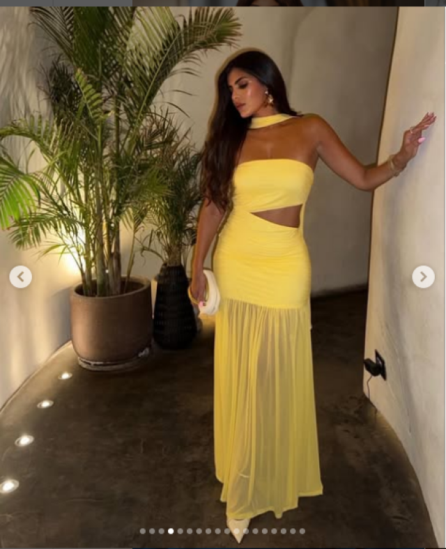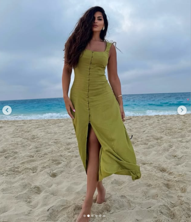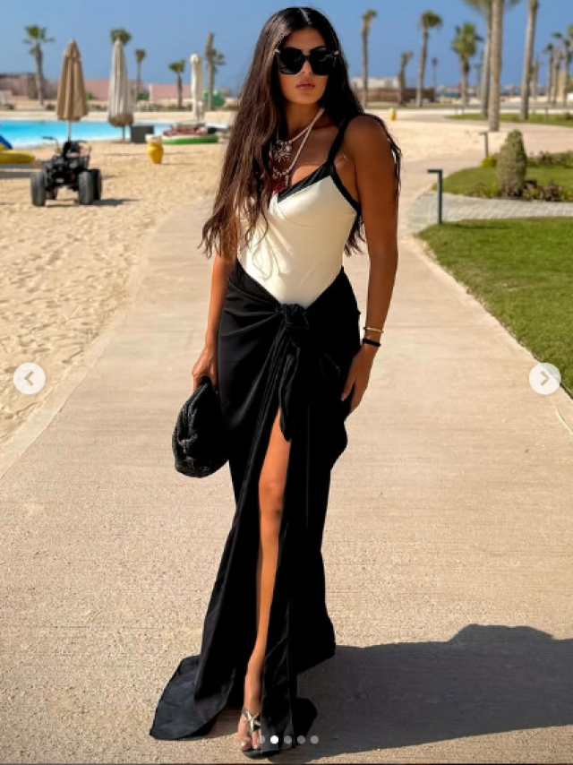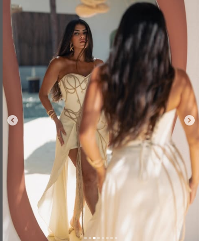 ظهرت زوجة ماجد المصري في الصور بإطلالة ملفتة، حيث ارتدت فستان طويل ذا أكمام مكشوفة واتسم بانه مصنوع من القماش الشيفون الشفاف.