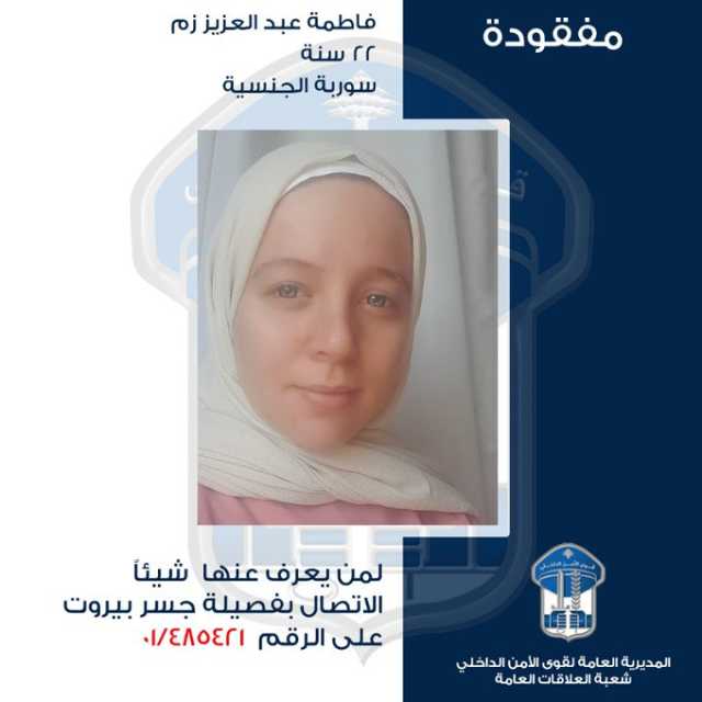 وكانت قوى الأمن قد أعلنت في وقتٍ سابق، عن فقدان فاطمة بعد خروجها من منزلها في النبعة بتاريخ 5-9-2025.