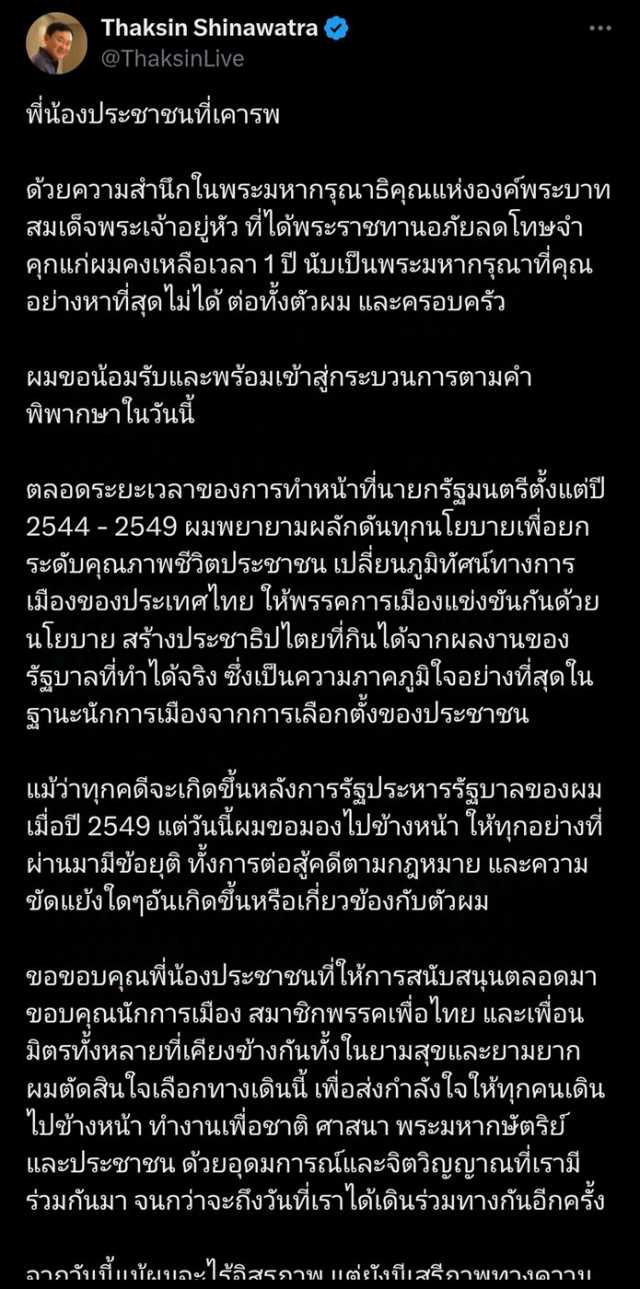 وكان تاكسين نشر على وسائل التواصل الاجتماعي بيانًا أعلن فيه قبوله قرار المحكمة بالسجن لمدة عام، وأكد أنه سيبقى قويًا جسديًا ونفسيًا.