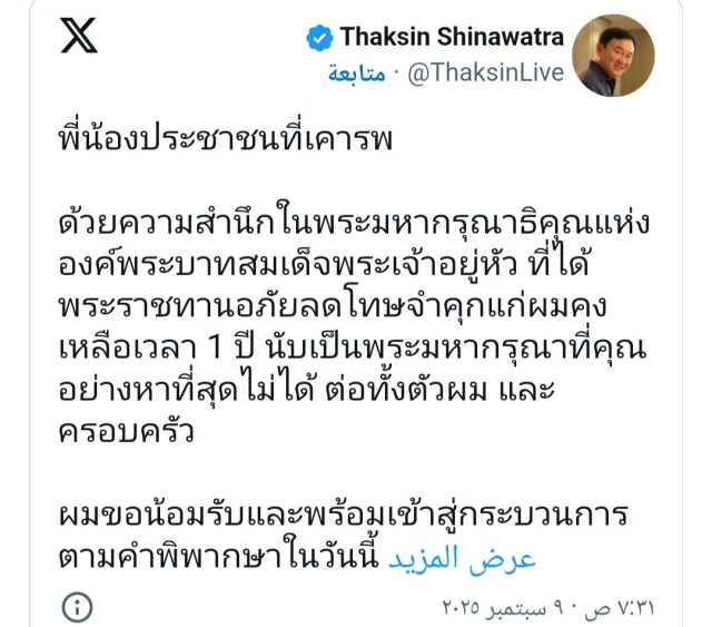فيما قالت بايتونجتارن، ابنة تاكسين، والتي كانت رئيسة للوزراء حتى الشهر الماضي، إن عائلتها تشكر الملك ماها فاجيرالونجكورن على تخفيف عقوبة والدها من ثماني سنوات.