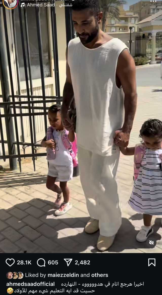 بينما شارك الفنان أحمد سعد متابعيه وجمهوره مقطع فيديو ظهر فيه وهو يقوم بتوصيل بناته في أول يوم دراسي لهم، عبر حسابه على “إنستجرام”.