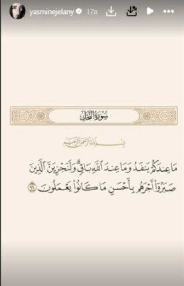 أول تعليق من ياسمين جيلاني بعد الطلاقوعلقت ياسمين جيلاني عبر خاصية الاستوري على موقع تبادل الصور والفيديوهات «إنستجرام»، في أول ردة فعل بعد انتشار خبر طلاقها بآية قرآنية من سورة «النحل»، كاتبة: «ما عِندَكُم يَنفَدُ وَما عِندَ اللَّهِ باقٍ وَلَنَجزِيَنَّ الَّذينَ صَبَروا أَجرَهُم بِأَحسَنِ ما كانوا يَعمَلونَ».