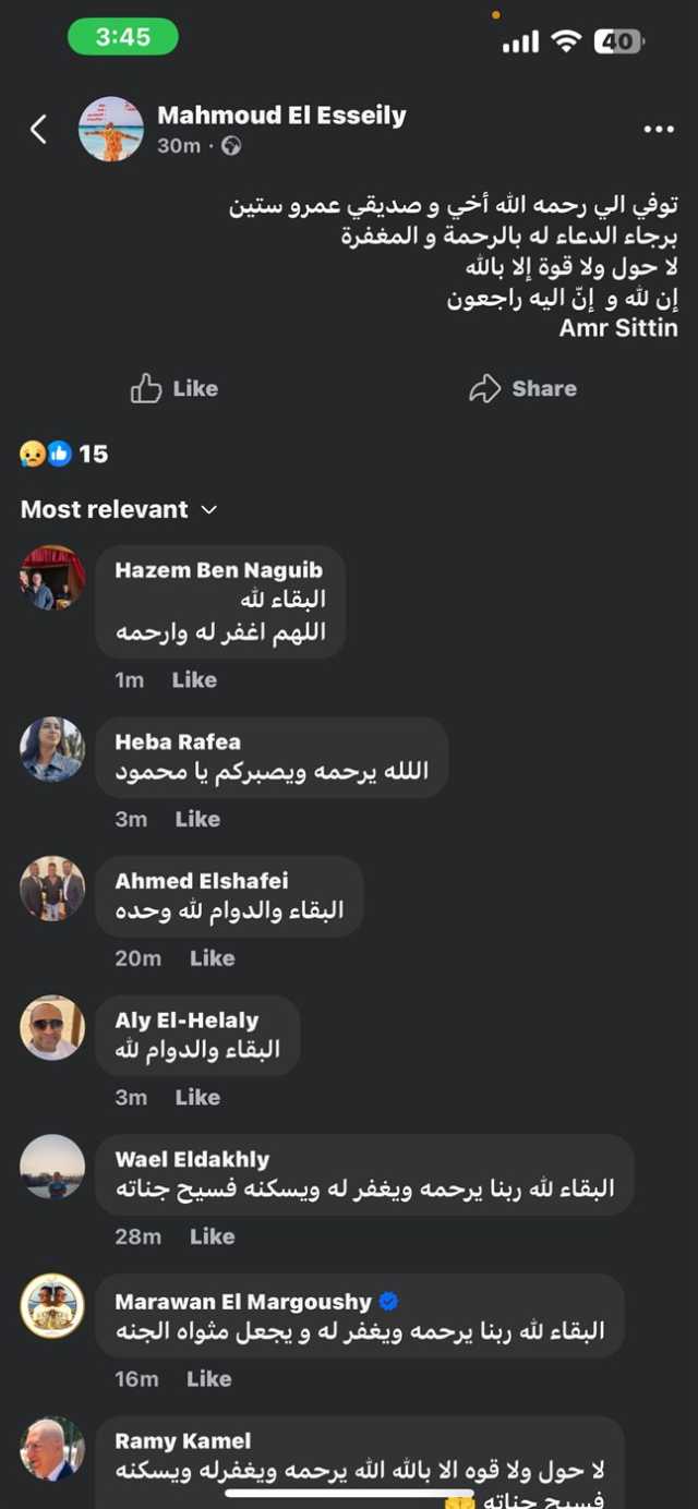 وكتب محمود العسيلي: "توفي إلى رحمه الله أخي وصديقي عمرو ستين، برجاء الدعاء له بالرحمة والمغفرة، لا حول ولا قوة إلا بالله إنَّا لله و إنّا إليه راجعون".