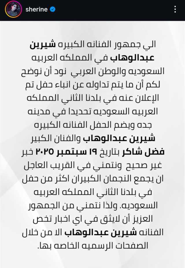 واصدرت شرين عبد الوهاب بيان عبر حسابها الرسمي بموقع انستجرام، جاء فيه: “ " إلى جمهور الفنانة شيرين عبدالوهاب فى المملكة العربية السعودية والوطن العربي نود ان نوضح لكم ان كل ما تداوله عن أنباء حفل تم الإعلان عنه فى بلدنا الثاني المملكة العربية السعودية تحديدا مدينة جدة ، ويضم الحفل الفنانة شيرين عبد الوهاب والفنان فضل شاكر بتاريخ ١٩ سبتمبر ٢٠٢٥ ، هو غير صحيح ونتمني فى القريب العاجل ان يجمع النجمان الكبيران أكثر من حفل فى بلدنا الثاني المملكة العربية السعودية”.