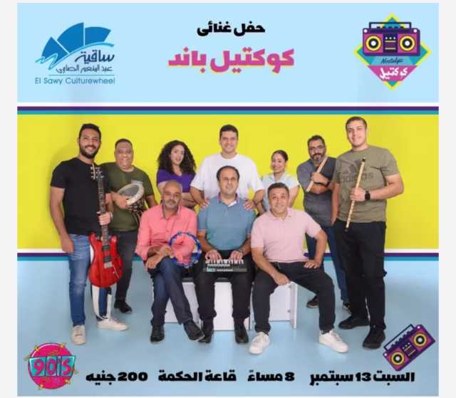 تستضيف ساقية عبدالمنعم الصاوي حفلًا غنائيًا لفرقة كوكتيل باند، وذلك في الثامنة مساء السبت المقبل بقاعة الحكمة، وسعر التذكرة 200 جنيهًا.