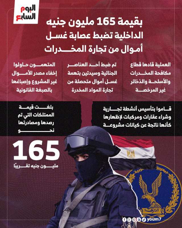 تمكنت أجهزة وزارة الداخلية من ضبط عصابة تتاجر فى المواد المخدرة وغسل متحصلات الجريمة المقدرة بنحو 165 مليون جنيه فى أنشطة شرعية أخرى.