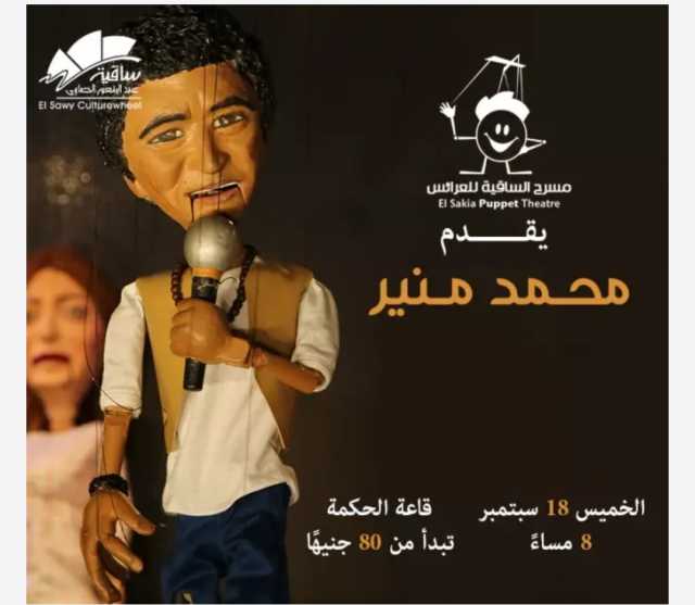 يقدم مسرح ساقية الصاوى للعرائس "محمد منير" في حفل فني، وذلك بمقر الساقية بالزمالك يوم الخميس المقبل الموافق 18 سبتمبر فى تمام الساعة الثامنة مساء على مسرح قاعة الحكمة، وأسعار التذاكر تتراوح بين 80، 100 جنيهًا.