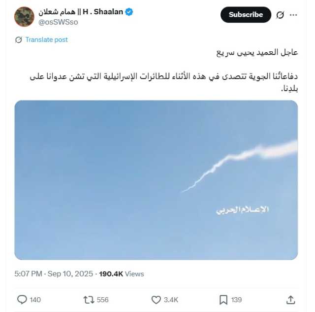 بيان القوات المسلحة اليمنية بشأن تنفيذ عملية عسكرية نوعية استهدفت أهدافا حساسة للعدو الإسرائيلي في منطقة القدس المحتلة وذلك بصاروخ باليستي فرط صوتي نوع فلسطين٢ الانشطاري متعدد الرؤوس وقد حققت العملية هدفها بنجاح بفضل الله. pic.twitter.com/NGy5zOZ9q7