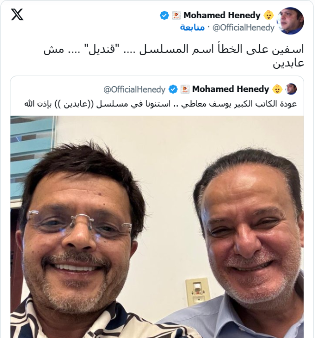 وكتب محمد هنيدي على “إكس”: "آسفين على الخطأ اسم المسلسل "قنديل" مش عابدين"، وذلك تصحيحًا لتغريدته الذي كتب فيها: “عودة الكاتب الكبير يوسف معاطي .. استنونا في مسلسل ((عابدين )) بإذن الله”.