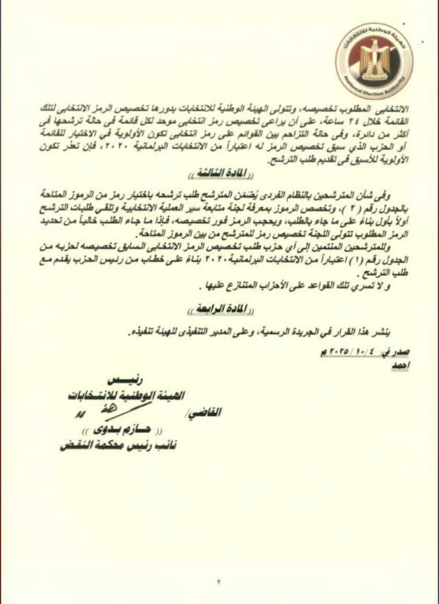 ويأتي هذا قرار الهيئة الوطنية للانتخابات في إطار التحضير المبكر للانتخابات البرلمانية التي تعد إحدى المحطات الرئيسية في مسار الحياة النيابية المصرية، بما يضمن نزاهة وشفافية العملية الانتخابية، ويعكس حرص الدولة على ترسيخ قيم الديمقراطية والمشاركة الشعبية الفاعلة في اختيار ممثلي الأمة.