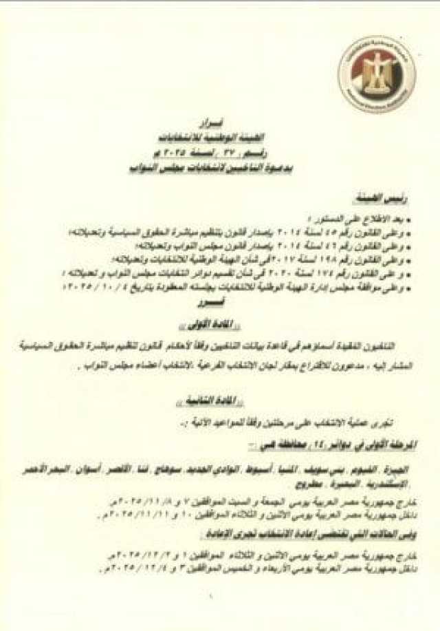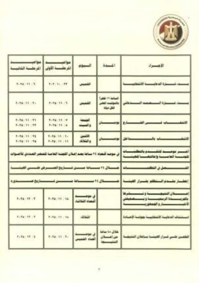 يكون التصويت لـ انتخابات مجلس النواب 2025 خلال المرحلة الأولى خارج الجمهورية 7 و8 نوفمبر، وفي الداخل 10 و11 نوفمبر، وتعلن النتيجة يوم الثلاثاء 18 نوفمبر، على أن تستأنف في ذات اليوم الدعاية لجولة الإعادة.