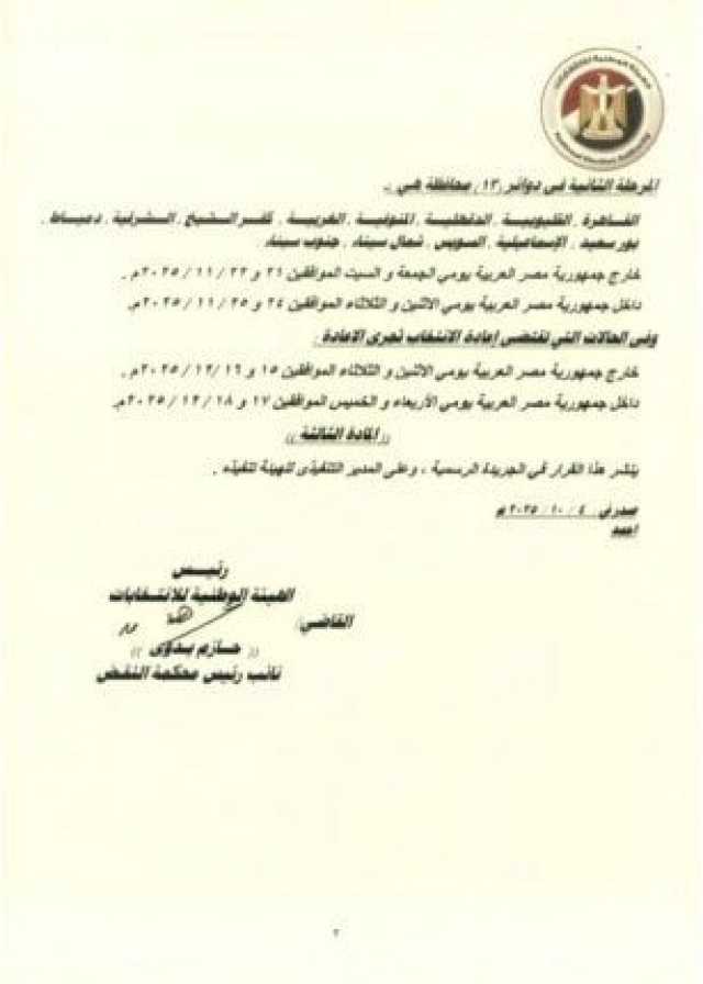 وقررت الهيئة أن تجرى جولة الإعادة بالنسبة للمرحلة الأولى من الانتخابات يومي 1 و2 ديسمبر خارج البلاد، على أن تجرى بداخلها يومي 3 و4 ديسمبر، وأن تعلن نتيجة جولة الإعادة للمرحلة الأولى يوم 11 ديسمبر.