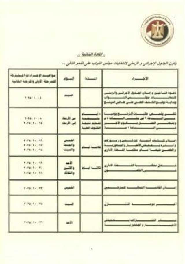 وتفصل محكمة القضاء الإداري في الطعون لمدة 10 أيام من يوم 19 وحتى 21 أكتوبر، على أن تعلن القائمة النهائية للمرشحين يوم 23 أكتوبر وآخر موعد للتنازل 25 أكتوبر، وتنشر التنازلات فى الجريدة الرسمية 26 أكتوبر.