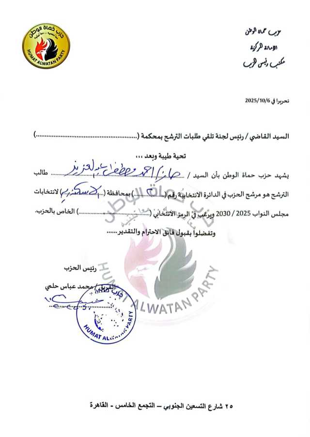 وتسلم "الريان" خطاب الترشح من الحزب كما أنهى إجراء الكشف الطبي، لتقديم أوراق تريحه في الانتخابات البرلمانية 2025.