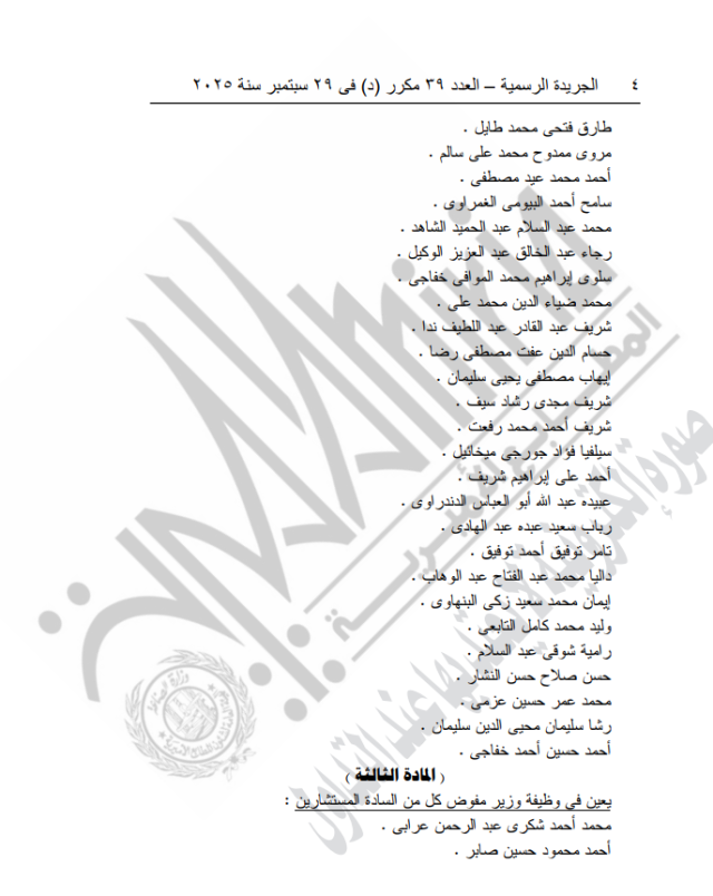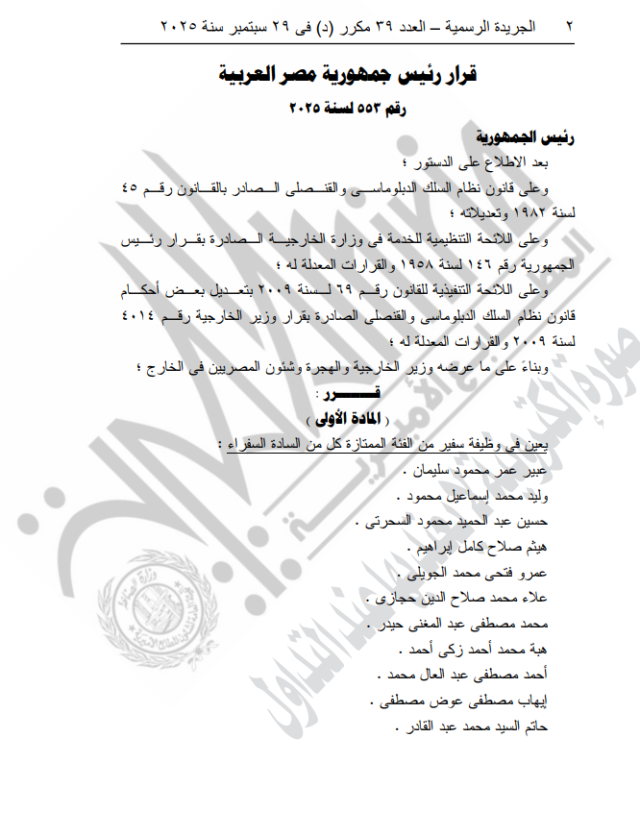 ونص القرار أن رئيس الجمهورية بعد الاطلاع على الدستور؛ وعلى قانون نظام السلك الدبلوماسي والقنـصلي الـصادر بالقـانون رقـم 45 لسنة 1982 وتعديلاته؛ وعلى اللائحة التنظيمية للخدمة في وزارة الخارجيـة الـصادرة بقـرار رئـيس الجمهورية رقم 146 لسنة 1958 والقرارات المعدلة له؛ وعلى اللائحة التنفيذية للقانون رقـم 69 لـسنة 2009 بتعـديل بعـض أحكـام قانون نظام السلك الدبلوماسى والقنصل الصادرة بقرار وزير الخارجية رقـم 4014 لسنة 2009 والقرارات المعدلة له؛ وبناء على ما عرضه وزير الخارجية والهجرة وشئون المصريين فى الخارج