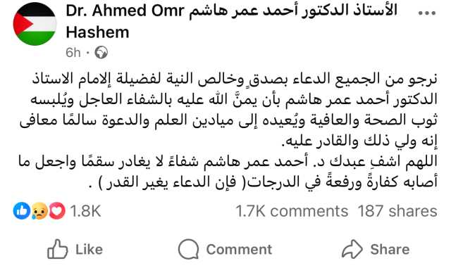 وجاء في البيان المنشور عبر صفحته على موقع “فيسبوك”: “نرجو من الجميع الدعاء بصدق وخالص النية للدكتور أحمد عمر هاشم بأن يمنَّ الله عليه بالشفاء العاجل، ويمنحه الصحة والعافية، ويعيده إلى ميادين العلم والدعوة سالمًا معافى، إنه ولي ذلك والقادر عليه.”