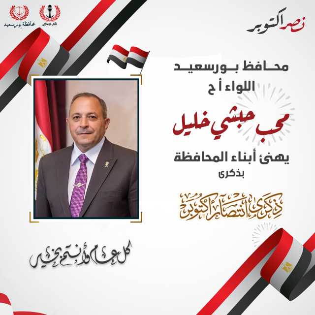 وجه اللواء أ ح محب حبشي محافظ بورسعيد، أسمى معاني التهنئة القلبية، اليوم، للشعب المصري عامة وأهل محافظة بورسعيد بصفة خاصة، وذلك بمناسبة الذكرى الثانية والخمسين لانتصارات أكتوبر المجيدة، أعادها الله على مصر وابنائها في خير ورخاء و تنمية و استقرار