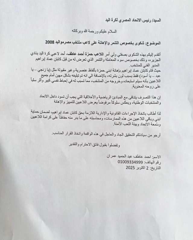 أتقدم إليكم بهذه الشكوى بصفتى ولى أمر اللاعب حمزة أحمد عاطف أحد لاعبى كرة اليد بنادى الجزيرة وذلك بخصوص سوء المعاملة والتنمر الذى تعرض له من قبل كابتن عماد إبراهيم المدير الفنى للمنتخب.