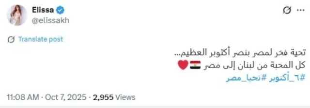 وكتبت إليسا، عبر حسابها الرسمي بموقع التغريدات «إكس»، قائلة: «تحية فخر لمصر بنصر أكتوبر العظيم، كل المحبة من لبنان إلى مصر».