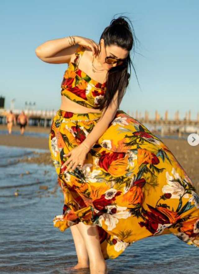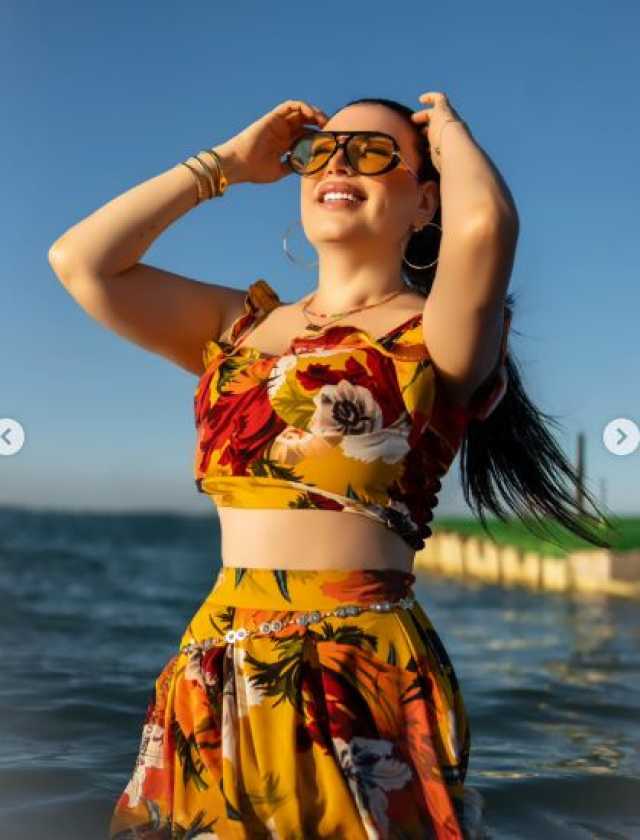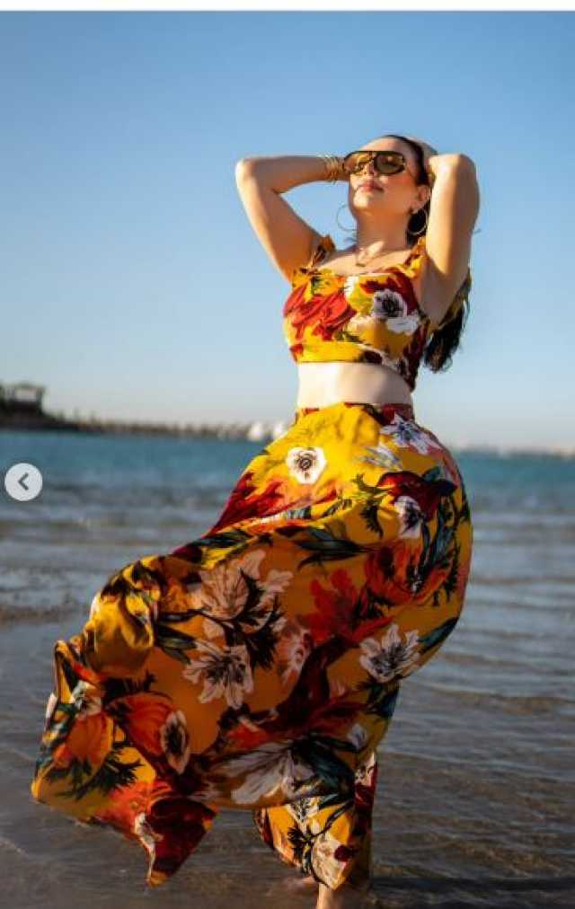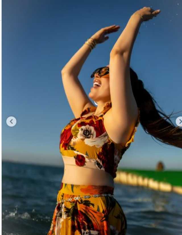 وبدت عبير صبري بإطلالة صيفية، تستجم بالطقس المنعش وسط البحر، مرتدية توب قصير كشف عن خصرها ونسقت عليه جيبة طويلة فضفاضة، صممت إطلالتها من قماش ناعم بأرضية صفراء ومزركش بالزهور الملونة الزاهية.