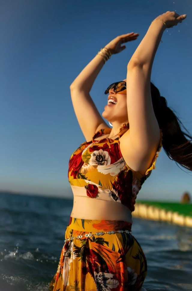 عبير صبري بإطلالة صيفية مبهجة على شاطئ البحر
