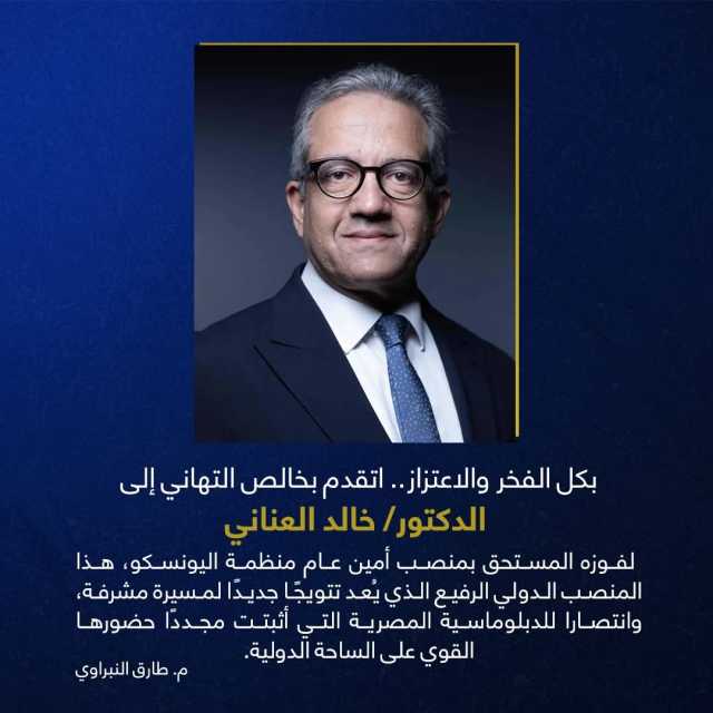 وقال النبراوي في بيان له: بكل الفخر والاعتزاز اتقدم بخالص التهاني إلى الدكتور خالد العناني؛ لفوزه المستحق بمنصب أمين عام منظمة اليونسكو، هذا المنصب الدولي الرفيع الذي يُعد تتويجًا جديدًا لمسيرة مشرفة، وانتصارا للدبلوماسية المصرية التي أثبتت مجددًا حضورها القوي على الساحة الدولية.
