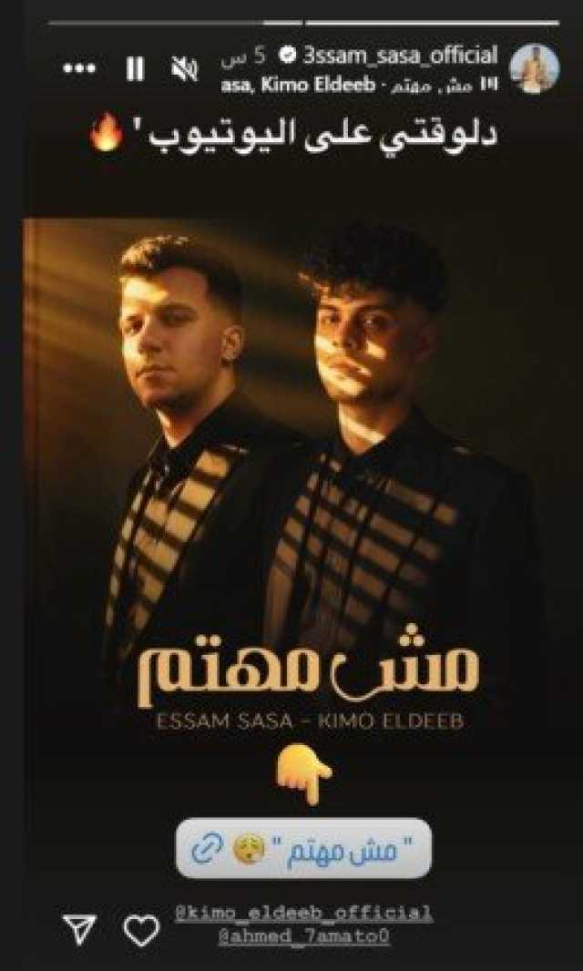 فاجأ مطرب المهرجانات عصام صاصا جمهوره، صباح اليوم الأربعاء 8 أكتوبر 2025، بطرح أغنية جديدة بعنوان «مش مهتم»، والتي يتعاون فيها مع مؤدي المهرجانات كيمو الديب، وذلك بعد ساعات قليلة من إخلاء سبيله بكفالة مالية على خلفية واقعة المشاجرة التي شهدها أحد الملاهي الليلية الشهيرة بمنطقة كورنيش المعادي.