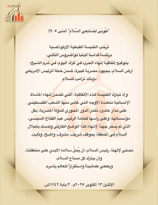 وأعربت الكنيسة عن مباركتها لهذه الاتفاقية التي تضمن إنهاء المأساة الإنسانية متعددة الأوجه التي عانى منها الشعب الفلسطيني على مدار عامين، مؤكدة تقديرها للدور المحوري الذي قامت به الدولة المصرية بكل مؤسساتها، وعلى رأسها فخامة الرئيس عبد الفتاح السيسي، الذي لم يدخر جهدًا لإنهاء هذا الوضع الكارثي، وتمسك بإحلال السلام في المنطقة بموقف شريف، مشرف، واضح، وثابت.