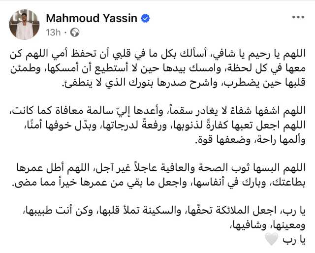 وكتب محمود ياسين على حسابه الشخصي على فيسبوك: "اللهم يا رحيم يا شافي، أسألك بكل ما في قلبي أن تحفظ أمي اللهم كن معها في كل لحظة، وامسك بيدها حين لا أستطيع أن أمسكها، وطمئن قلبها حين يضطرب، واشرح صدرها بنورك الذي لا ينطفئ.