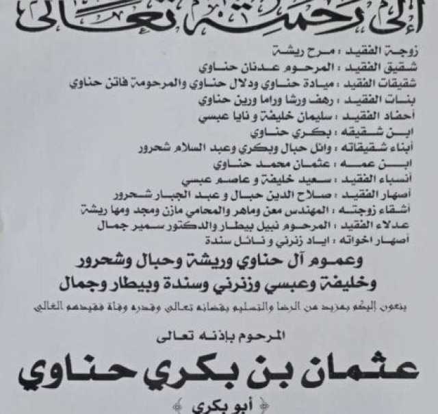 وشيعت جنازة عثمان الحناوي، من دار الشفاء بالعدوى في دمشق عقب صلاة العصر من مسجد الروضة، ليدفن في مقابر العائلة باسم مقبرة الدحداح، ويقام العزاء اليوم الثلاثاء وغدا الأربعاء، بصالة نقابة الأطباء مقابل حديقة المدفع بدمشق.