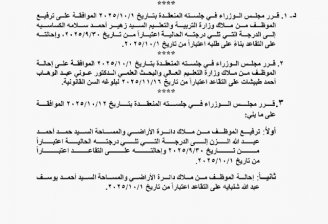 كلمات دلالية: سواليف قرارات مجلس الوزراء موظفي الوزارات التقاعد إنهاء خدمات