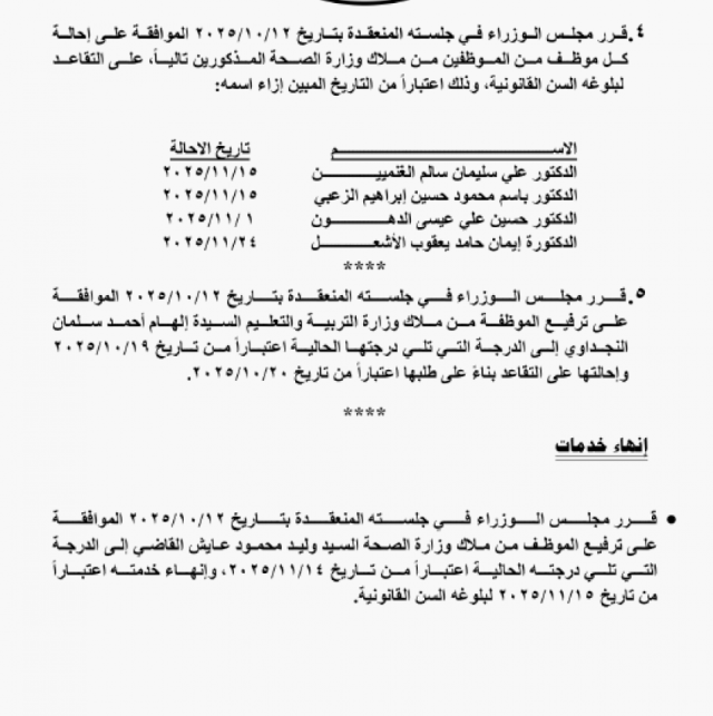 صدرت في عدد الجريدة الرسمية اليوم الخميس، إرادات ملكية و #قرارات #مجلس_الوزراء بإحالة عدد من #موظفي_الوزارات والدوائر الحكومية إلى #التقاعد و #إنهاء_خدمات آخرين.
