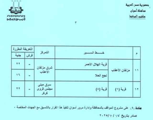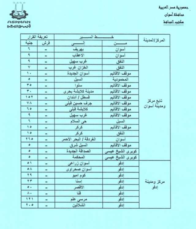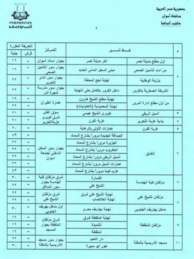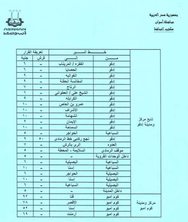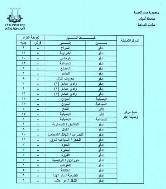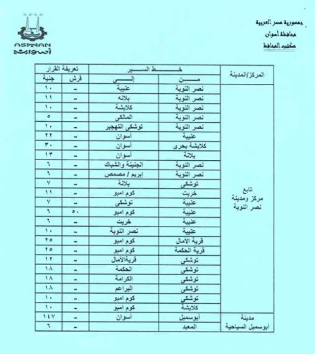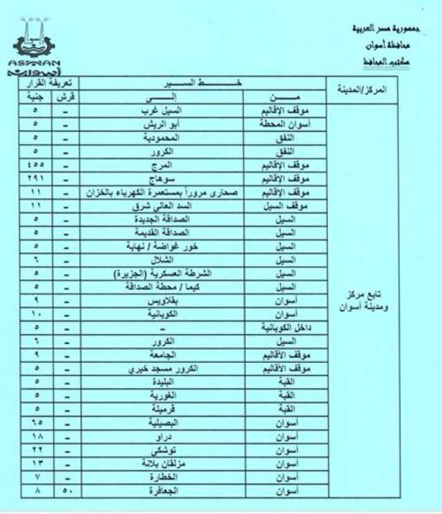 كلمات دلالية: التسعيرة الوفود أسوان تعريفة للمواصلات الداخلية والخارجية جنیه إلى