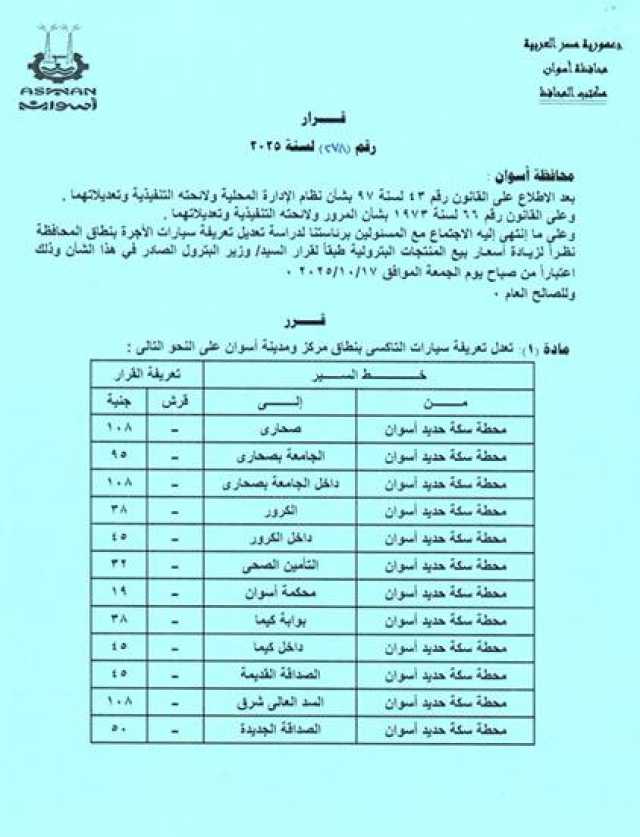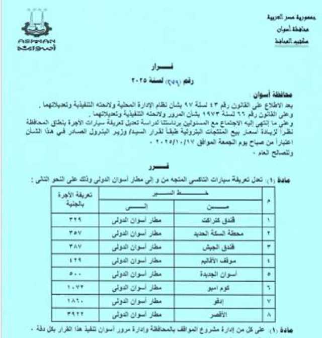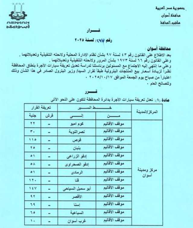محافظ أسوان يقرر تعديل تعريفة الأجرة للمواصلات الداخلية والخارجية
