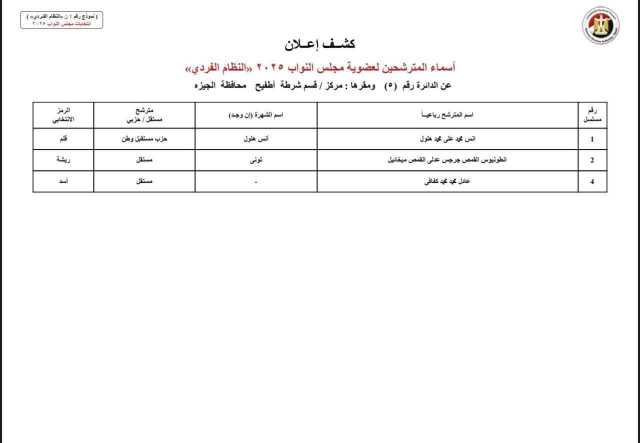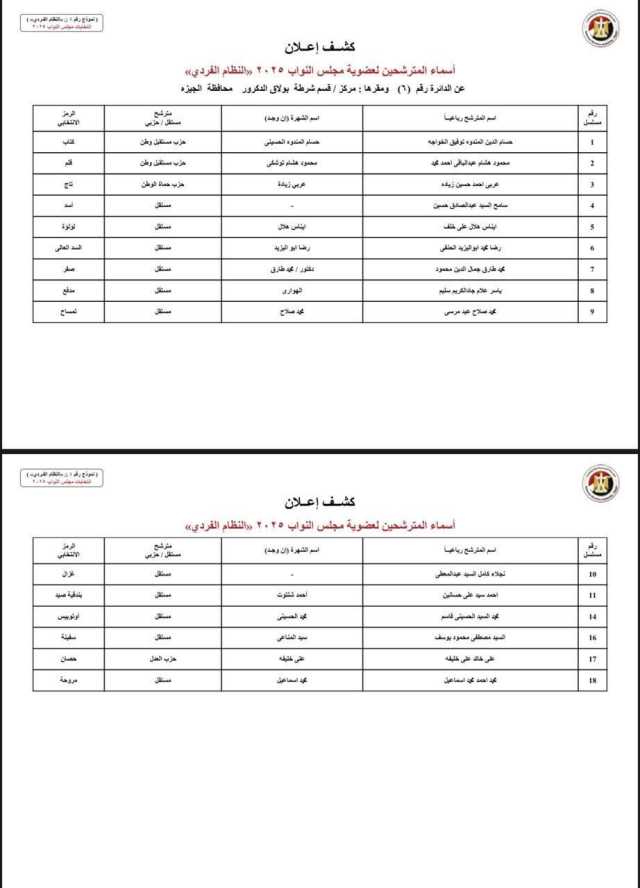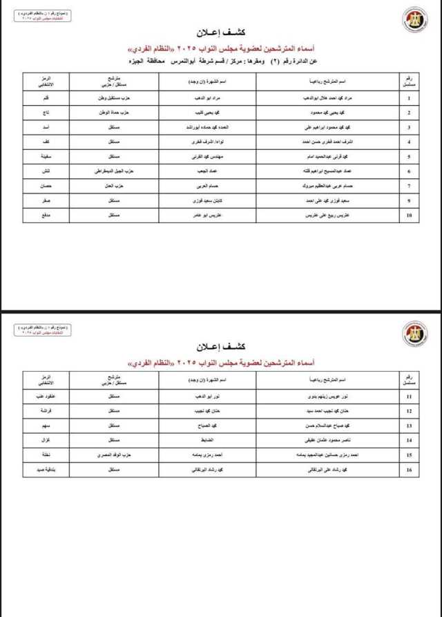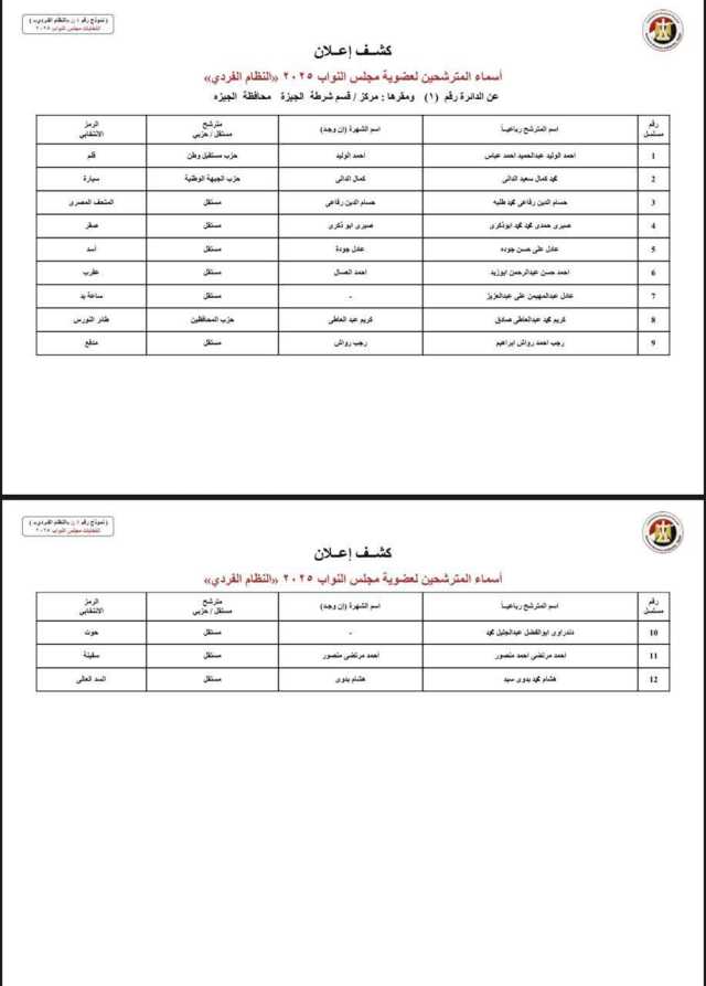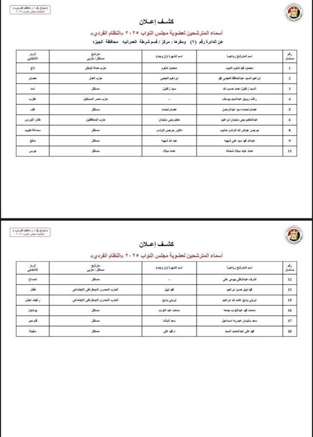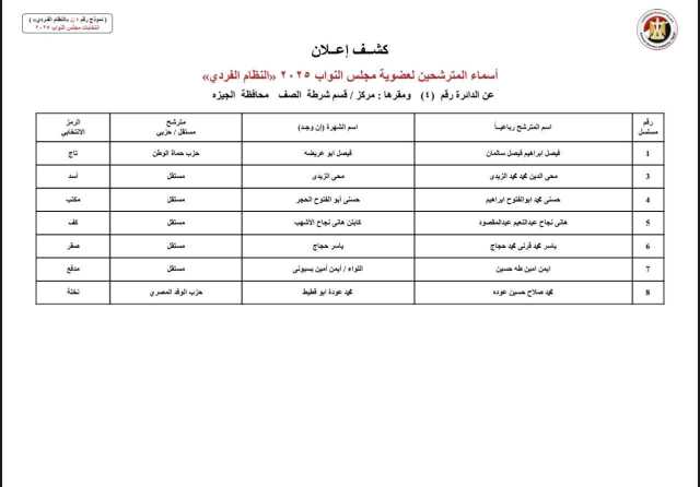 ننشر أسماء المرشحين على دوائر الجيزة بـ انتخابات مجلس النواب
