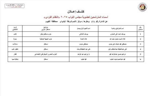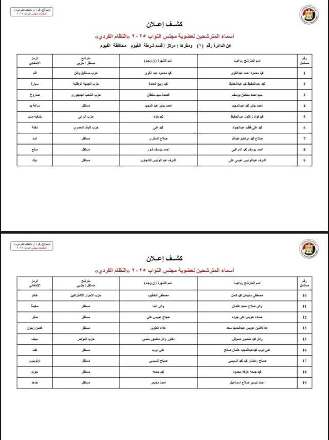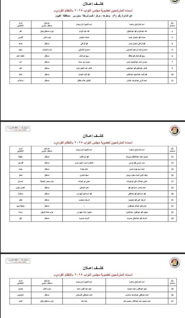 وضمت القوائم الأولية أسماء المرشحين في الدوائر الانتخابية الست بالمحافظة، وهي: بندر الفيوم، مركز الفيوم، إطسا، سنورس، طامية، وأبشواي – يوسف الصديق، حيث تقدم عدد من المرشحين من مختلف الخلفيات السياسية، من بينهم نواب حاليون يسعون للاحتفاظ بمقاعدهم، إلى جانب عدد كبير من المستقلين والمرشحين الجدد.