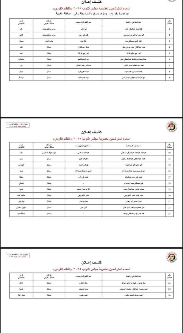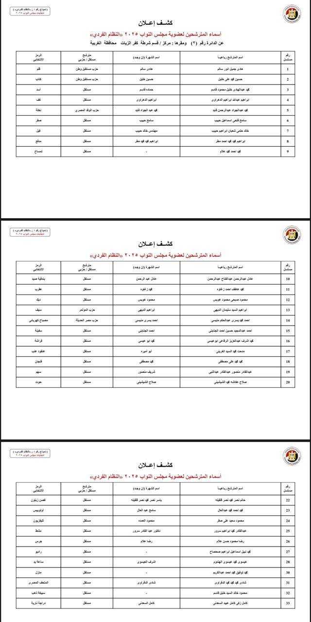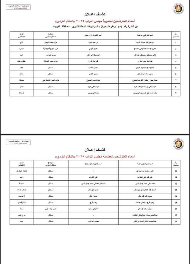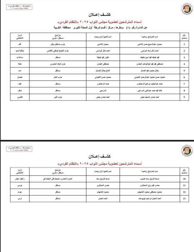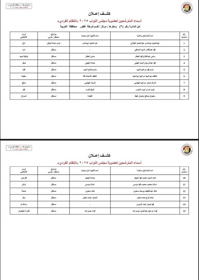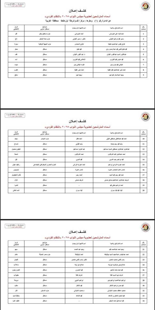 إعلان القائمة المبدئية للمرشحين الفرديين في انتخابات النواب بمحافظة الغربية