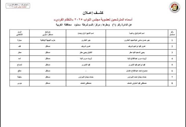 أعلنت الهيئة الوطنية للانتخابات عن الكشوف المبدئية للمرشحين الذين تقدموا للتنافس على المقاعد الفردية في دوائر محافظة الغربية.