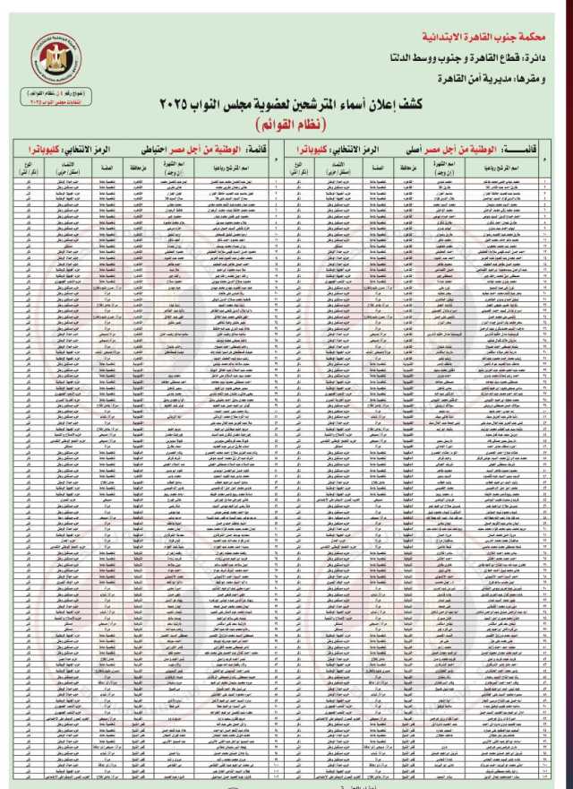 أعلنت محكمة جنوب القاهرة الابتدائية عن القائمة الوطنية المرشحة لانتخابات مجلس النواب بدائرة قطاع القاهرة وجنوب ووسط الدلتا.