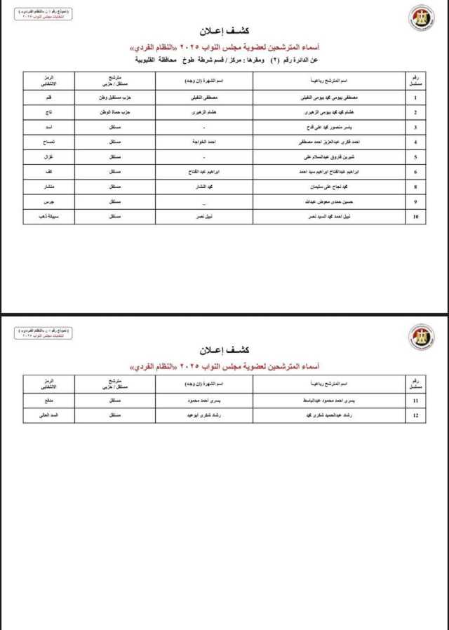 ينشر موقع صدى البلد أسماء المرشحين المتقدمين بأوراق ترشحهم لخوض انتخابات مجلس النواب بـ محافظة القليوبية وتبلغ عدد دوائرها، 6 دوائر، وهي كالتالي: